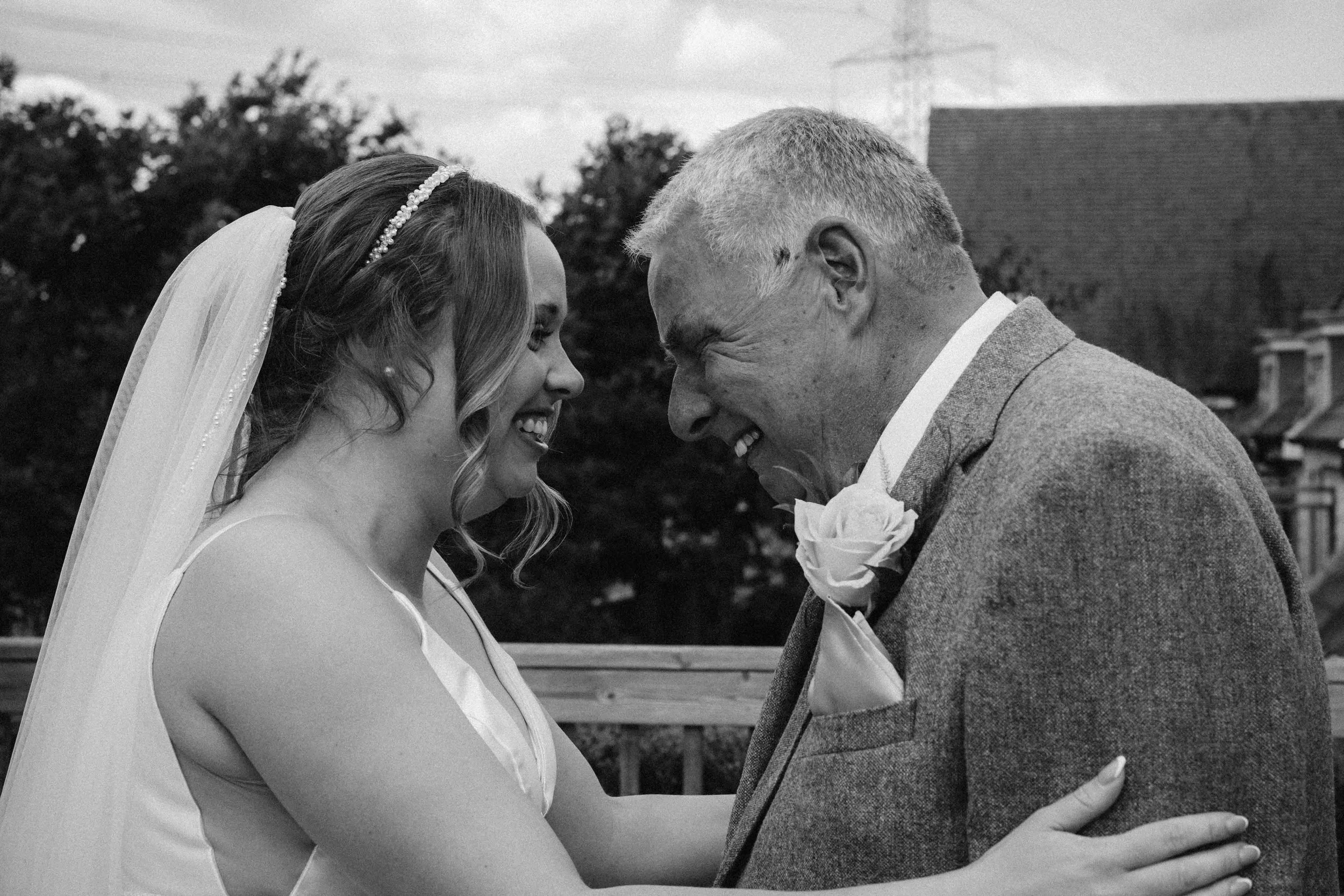 A bride and groom smiling and leaning their foreheads together during their wedding celebration outdoors with greenery and a brick wall in the background.